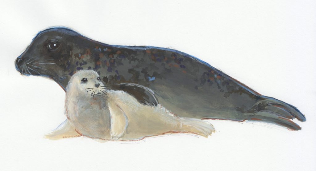 Grey seals are born with white lanugo fur and molt into their adult fur after about a month. By then they are already weaned, but need to finish molting until they can learn to hunt.