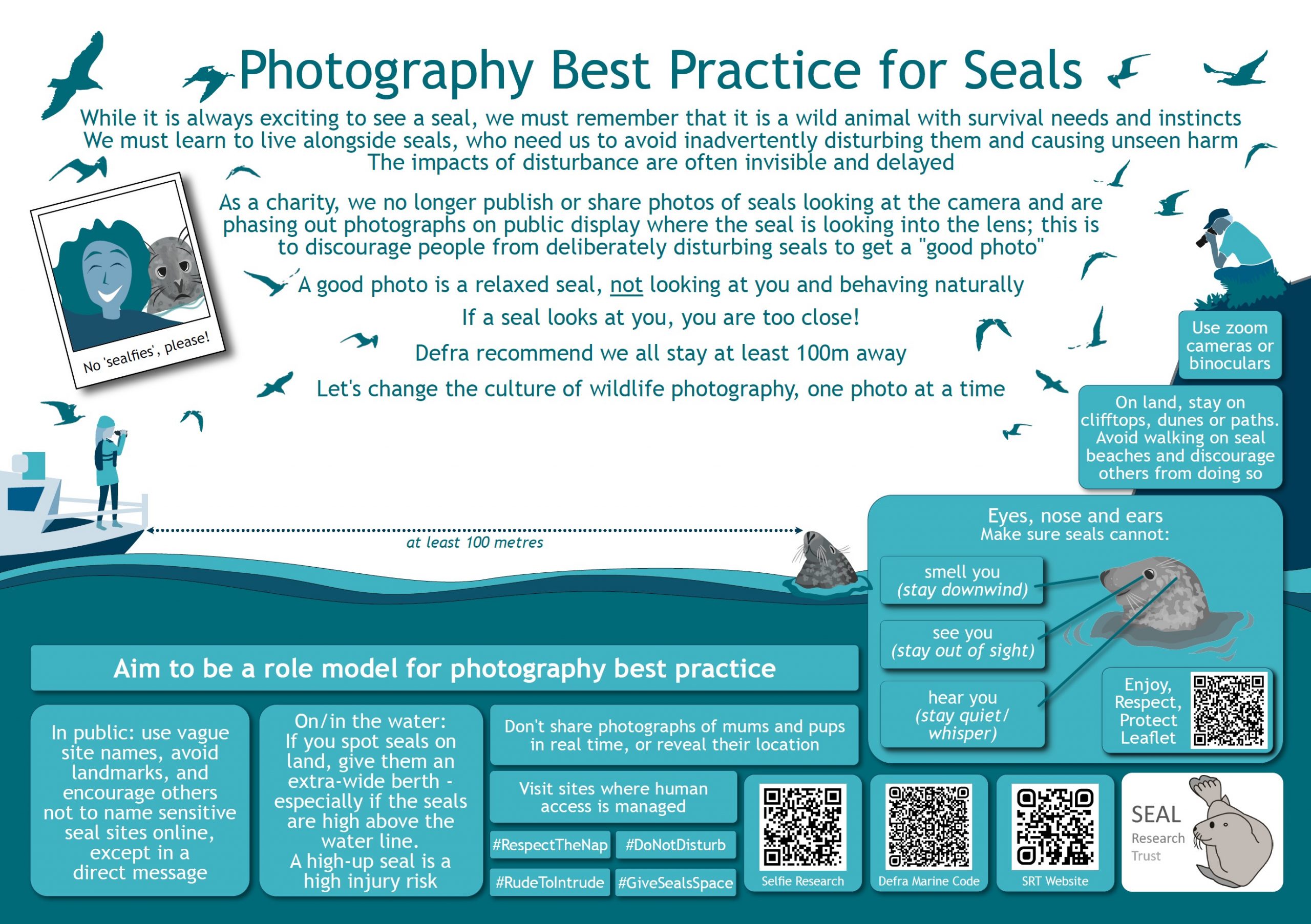 If you post a seal’s location or publish selfies with a seal, it will just encourage more people to seek it out and do the same. Especially if it’s a pup, it has a hard enough life and might end up where a lot of people frequent the beach due to inexperience. Don’t add to the load! If a seal appears to be in distress, share its location with a rescue organization instead.
